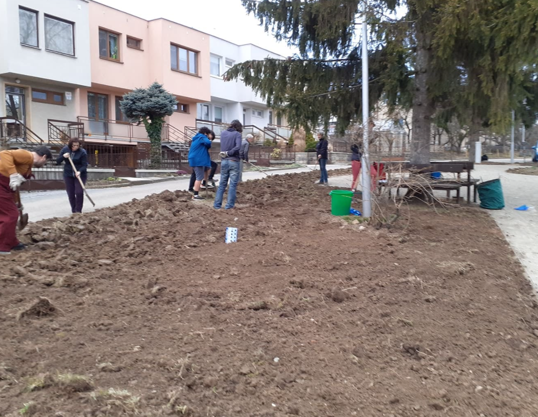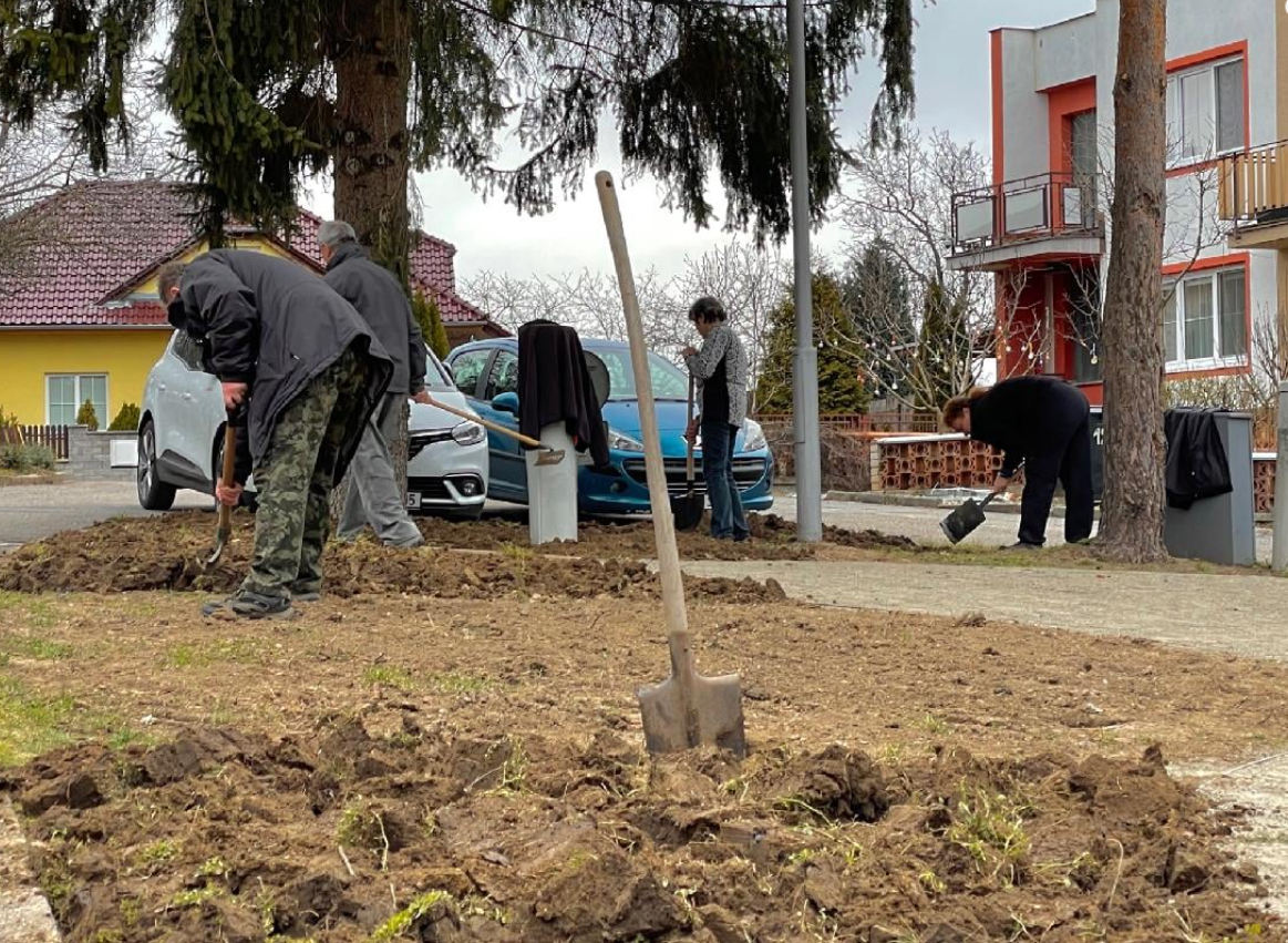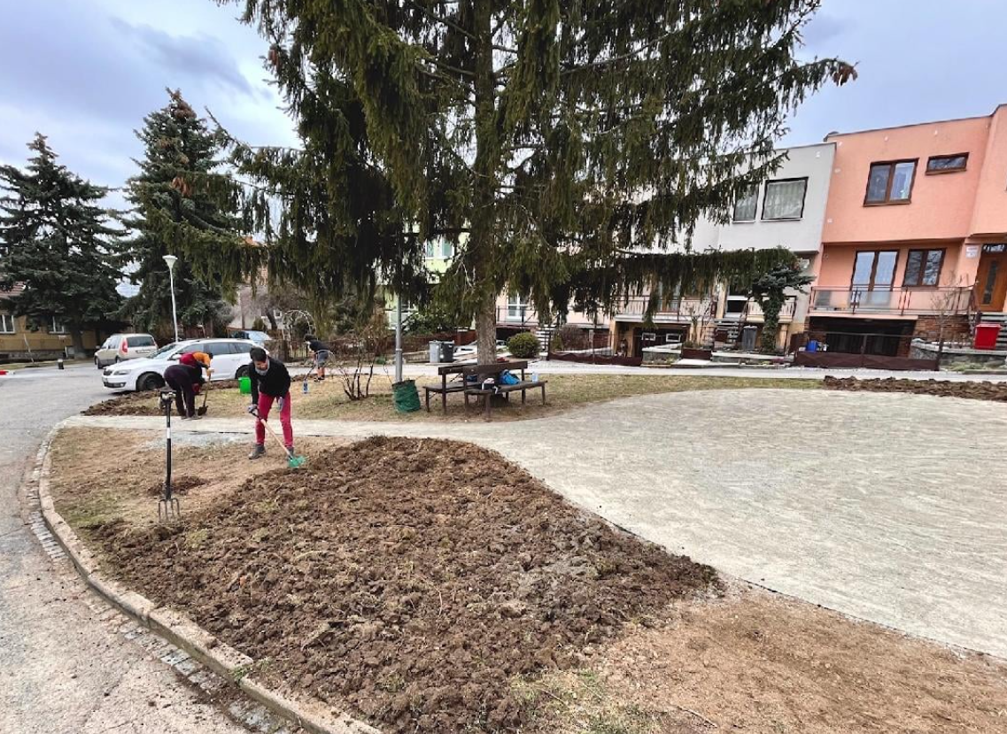 Bří Mrštíků, část II – z 27. 03. 2021 V sobotu jsme se sešli na “brigádičce” na Bří Mrštíků a další část je hotová. Připraveno k výsadbě. Porada před Bří Mrštíků celkový pohled